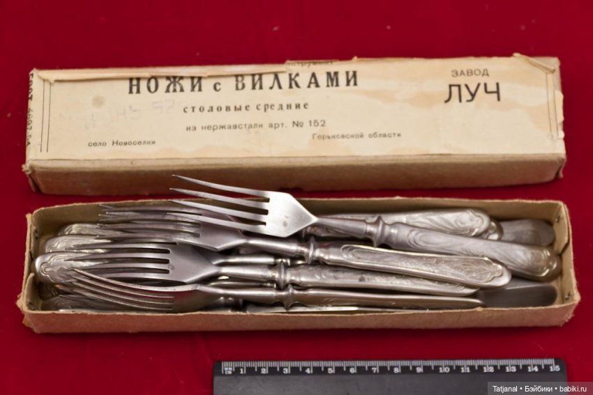 А ещё у нас была алюминиевая посудка с пластмассовыми ручками черного цвета. На кастрюльке ручки и на крышке ручка — пластиковые. Кастрюли три разные, сковорода одна, тарелочки плоские и тоже вилки, ножи, ложки, половник. Всё было в серой коробке, которую сразу выбросили, я и не думала прочитать что там написано, имею в виду фабрику. Помню только внутри листочек вложен был и перечислены все предметы набора.