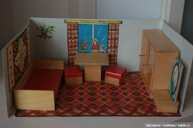 У меня в детстве была мебель малютка, в 85 году мне исполнилось 7 лет и папа подарил мне набор. Это был просто волшебный подарок! Деревянная мебель в красивой картонной коробке, ещё и ковёр там был картонный и три стены. К сожалению этот наборчик не пережил переезды(((( сейчас у меня только диванчик такой есть.