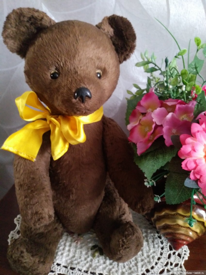 Сегодня приехала к сестре.Она занялась разбором старых, многолетних антресольных запасов. Этот мишка, много лет хранился в семье. Примерно, ему 50-53 года.После нас с сестрой, им активно, но аккуратно, играли племянницы.Когда-то, я пыталась мишку забрать- не отдали…