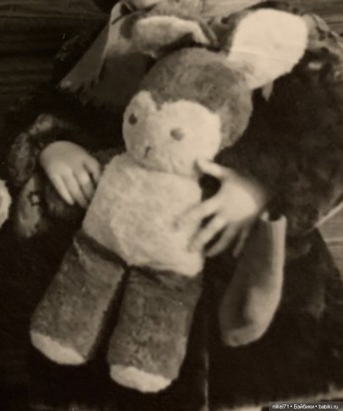 Чудом выжила, хотя родители регулярно проводили зачистки и выносили на помойку игрушки. Потом Жаконя стала другом моему сыну. От второго уже стали её прятать, ткань не выдерживала штопки. Когда родилась дочка, две обезьяны( вторую подарила нам с сестрой соседка, когда мы были уже подростками) окончательно поселились в коробке с доставанием раз в год на проверку.