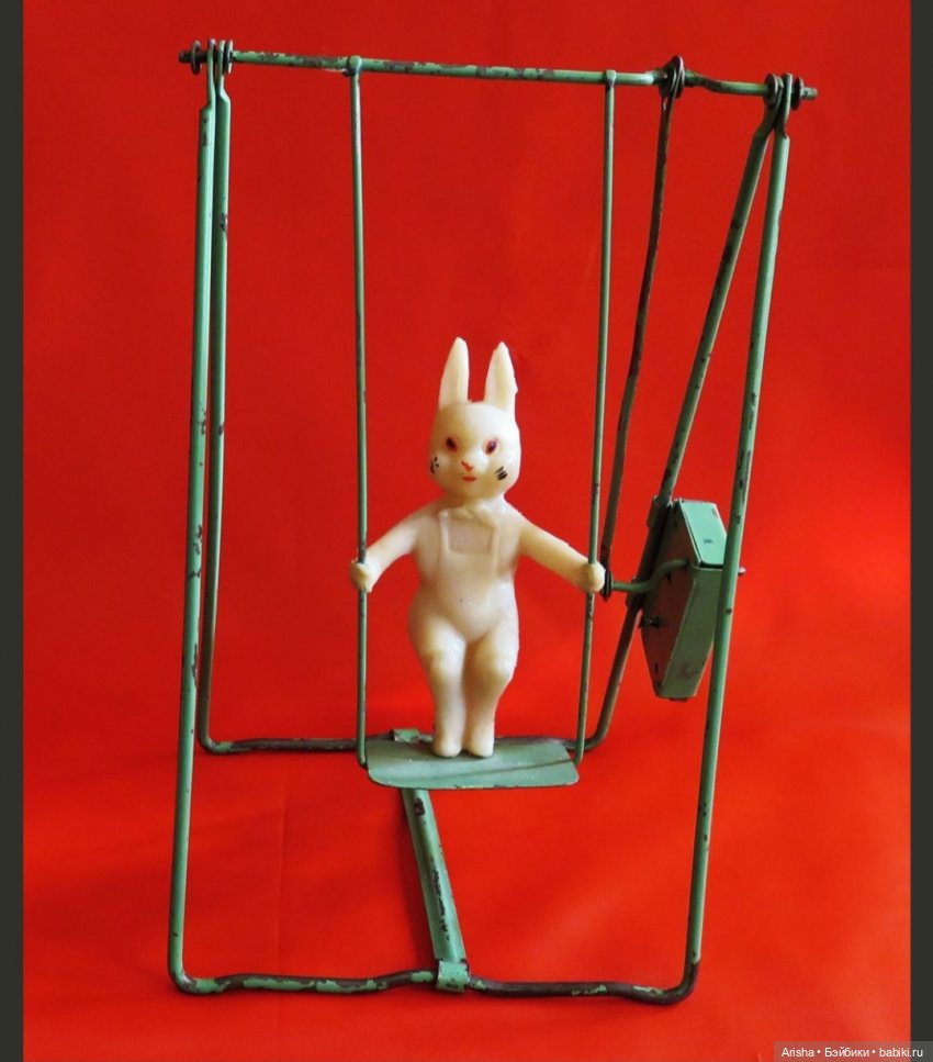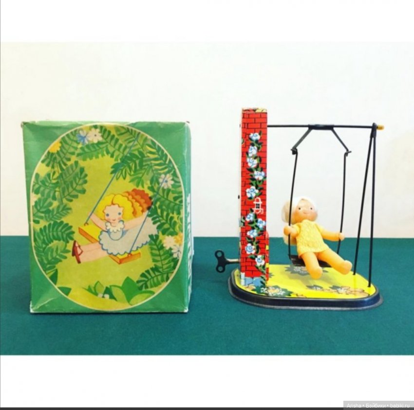 Сама девочка ростом 14 см, голова целлулоид, тело текстиль набивное. Прическа паричок, глазки нарисованы. И милейшая одежда, и даже бантик!)) Механизм заводной. При заводе качели качаются. Если правильно понимаю это выпуск Москва 1950-х годов.