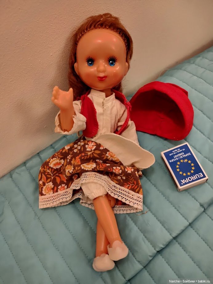 Милая такая! А ткань юбочки похожа на ткань летнего костюмчика, в который была одета такая куколка в моей юности: штанишки чуть ниже колен на резинке снизу и кофточку из этой же ткани. Вроде цельные, как комбинезончик.