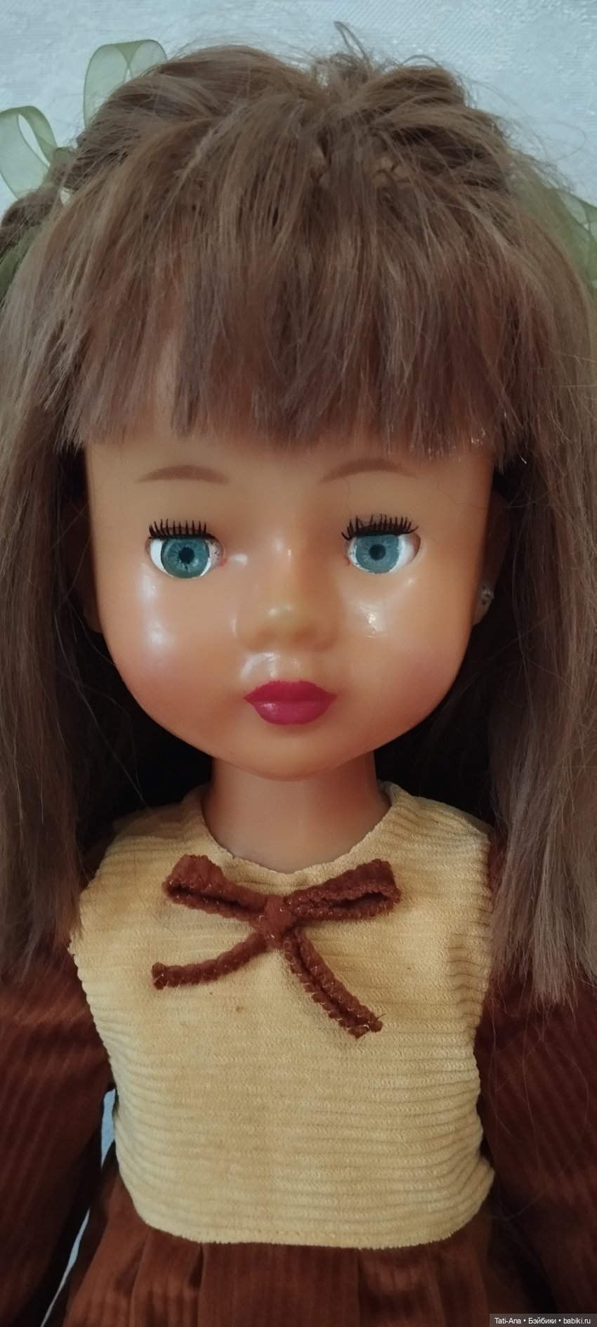 А меня же поразили волосы куклы! Посмотрите! Никаких следов сползания внутрь головы, никагого «гнезда», которое необходимо распутывать, ни одной пустой лунки. А лет-то кукле немало!
