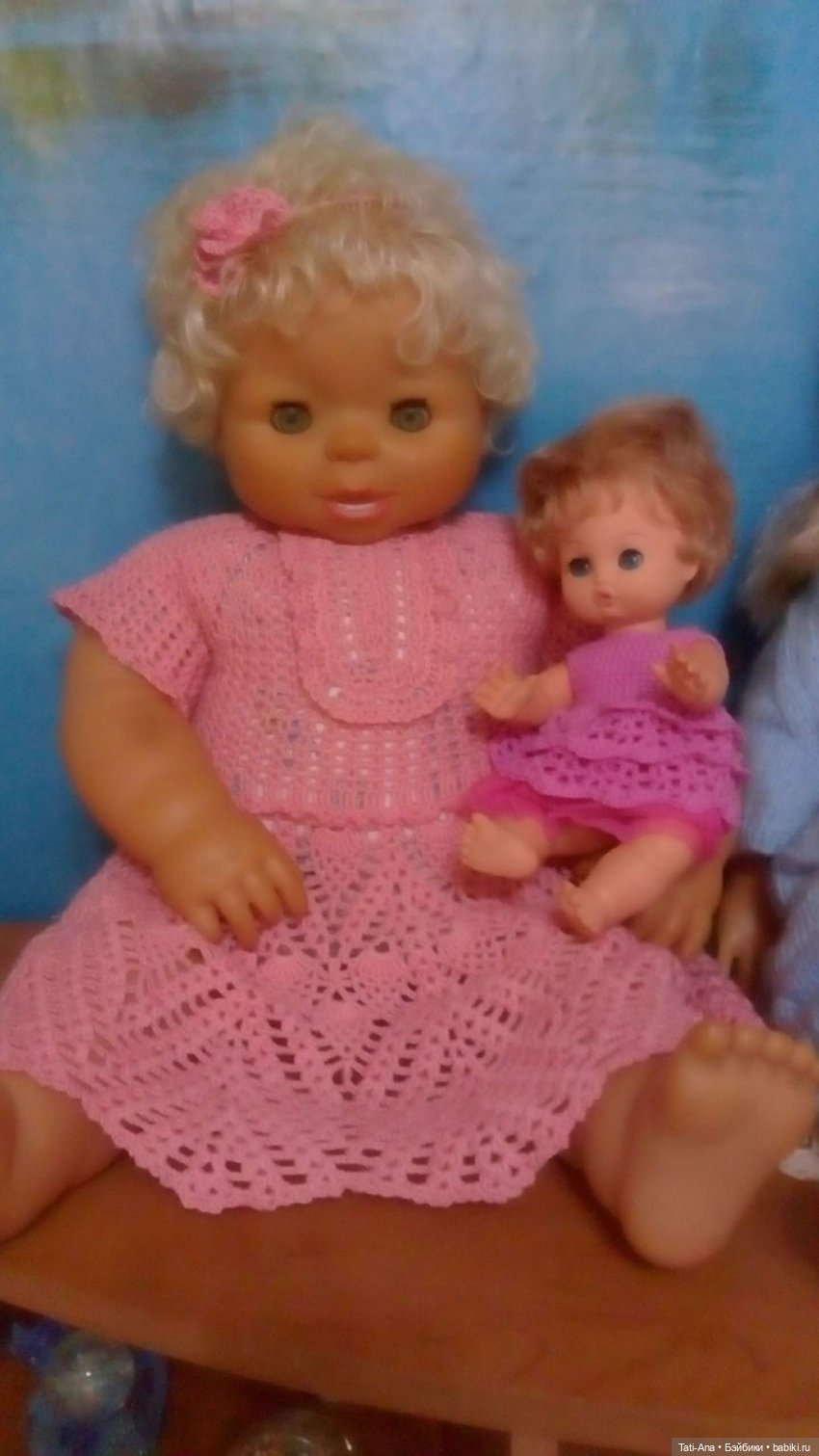 Нашла фото, сохраненных мамой, кукол. Сейчас смотрю и думаю, вот заброс размеров был, на любой вкус и цвет. Интересно, как мы с этим огромным, язык не поворачивается назвать, пупсом играли? Наверное, мало, поэтому и сохранился лучше всех