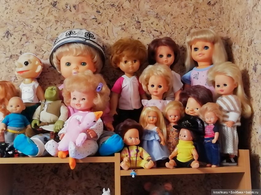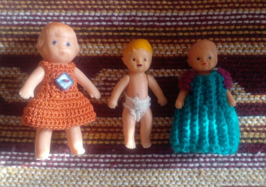 У меня в детстве было много игрушек — целый картонный ящик, упаковка из-под телевизора. И как-то с куклами я не очень много играла, хотя они тоже были. Я немного помладше, с 73-го. Но были у меня немки (тогда — одна, небольшая «хитруля»), и позже пупсы, парочка, такой как ваш в конверте, и Тебу, и крупная немецкая кукла-пупс, но такого «пинетки» не было. Зато, как оказалось, он был у моей одноклассницы (у неё папа был директором крупного завода в нашем городе, и конечно, достаток в семье был другой, да и ездили они по стране, в отличие от нас). Мне конечно этот пупс нравился. Но я не просила никогда, более того, я не могла играть чужими игрушками, те, что мне нравились, должны были быть моими, и никак иначе. Мы играли большими немецкими куклами, я приносила к ней свою. И вот однажды я увидела, что этот пупсик заброшен, и с ним что-то не так. У подруги был пёс, эрдельтерьер, и он этого «пинетку» пожевал(. Именно голову, и ещё оторвал одну ножку у самого резинового тяжа-перекладины, так что ножка осталась целой, но соединения ног не было… Лицо не очень сильно пострадало, но подруга его уже «списала в утиль». И я насмелилась попросить его у неё. Девочка согласилась, отдала его мне, всё равно хотела выбросить. Тогда я и попробовала впервые свои силы в восстановлении кукол)), как могла, конечно. Ножка была соединена с другой посредством прокалывания соединительного тяжа иголкой насквозь. Держалось не очень, но держалось. Пожёванную головку отмыла от краски на волосах, а покусы заплавляла ножиком, лезвие грела на конфорке. Хорошо, что мама не видала, чем я занимаюсь, пока дома никого нет)). Спору нет, сейчас у меня получилось бы лучше)). Видно с тех пор я и жалею убогих кукол, и иногда покупаю под восстановление — жалко. К сожалению многие мои куклы не сохранились. Пупсов я восстанавливать не стала. Хотя ещё не поздно)). А вот мои родные пара немок сохранилась. Потом к ним присоединилась крупная, заброшенная хозяйкой немка с проигрывателем внутри, и докупила близняшку моей хитрульке (а к ней «прицепилась в лоте ещё одна), и поигранную номерную красотку, подарок крёстной, и тоже мною где-то когда-то утраченную, и её номерную сестрёнку-близняшку, и ещё чудика, который мне очень нравился у моей двоюродной сестрички. И бедолагу с блошки, и детку с Мешка, и киссмишку от землячки-сохоббита, и убитую криворучку из ВК… и думаю, что список может продолжиться в любой момент))). На фото не все: