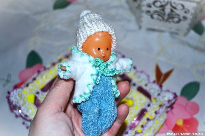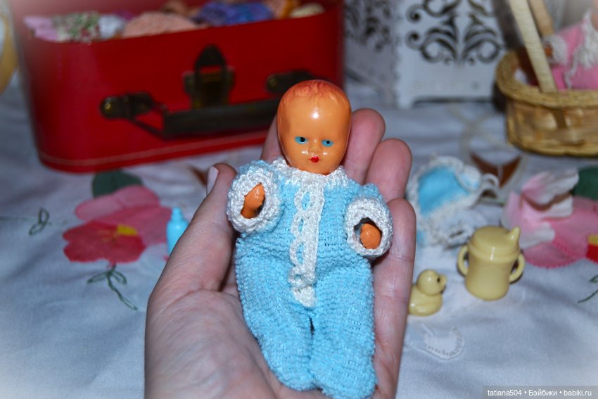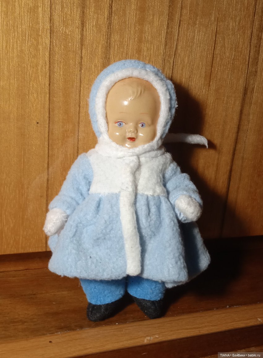 Этот пупсик тоже из целлулоида, около 14 см. Он у меня тепло одет. Но специально раздела для фотографии.