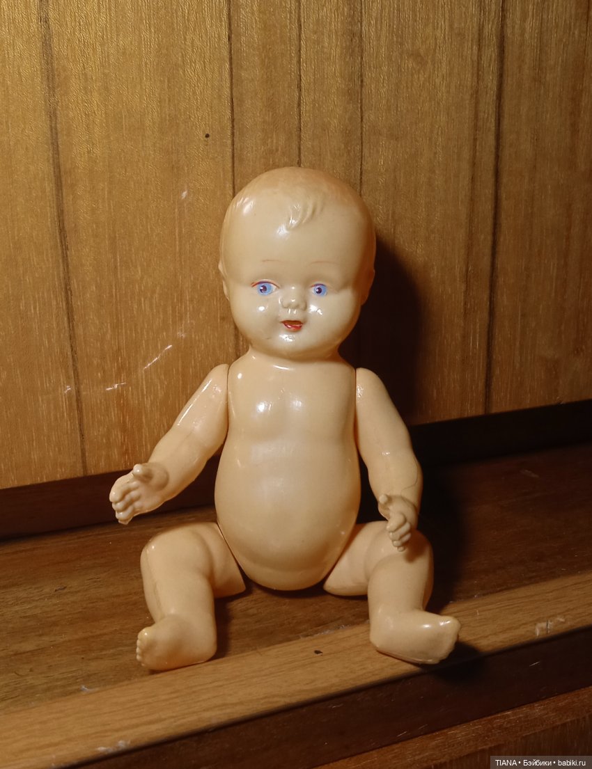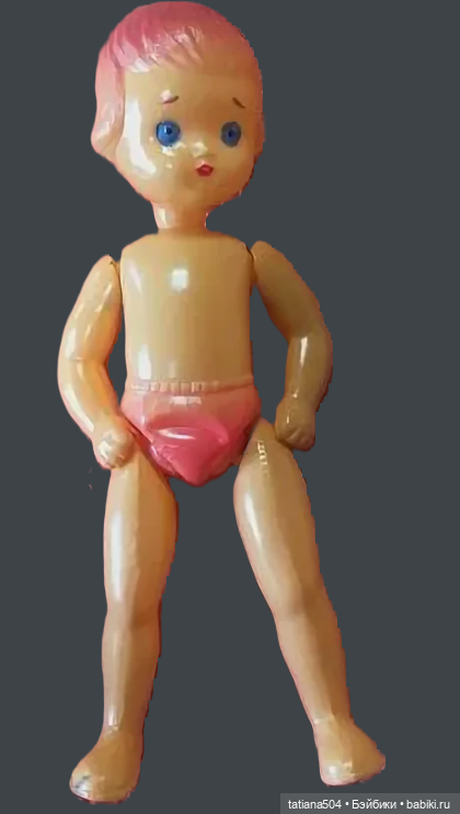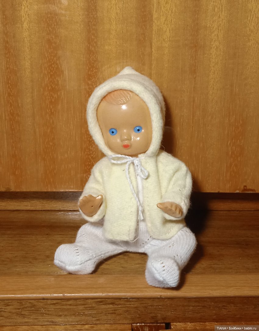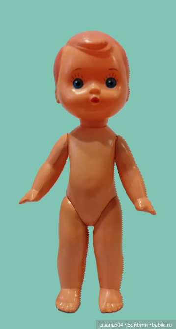 Есть еще один малыш из СССР, безымянный, к сожалению не нашла про него информацию, он сидячий — литой, тело пластик, ручки как у Шуриков на резиночках, одинаковые по виду, а личико резиновое, с росписью.