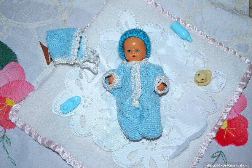 Выпускала таких пупсов «Малютка», московская фабрика игрушек 8 Марта, в комплекте к ним шли кусочки хлопковой ткани – бязь, фланель, отрезок кружева, таз или ванночка. И любая девочка могла отточить первые навыки по шитью, что я с удовольствием и делала. При этом научившись чуточку вязать еще и вязала им кофточки и шапки. Платья были очень примитивные – полу-солнце и две дырочки, главное было за «счастье» найти не сыпучую красивую ткань.