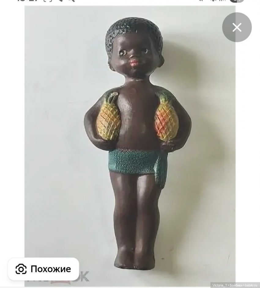 У меня только был единственный негритенок — тоненький. Он был в виде небольшой куколки, около 25 см, примерно, весь резиновый, в нарисованных плавках, кажется весь литой, как столбик. Улыбчивый такой))