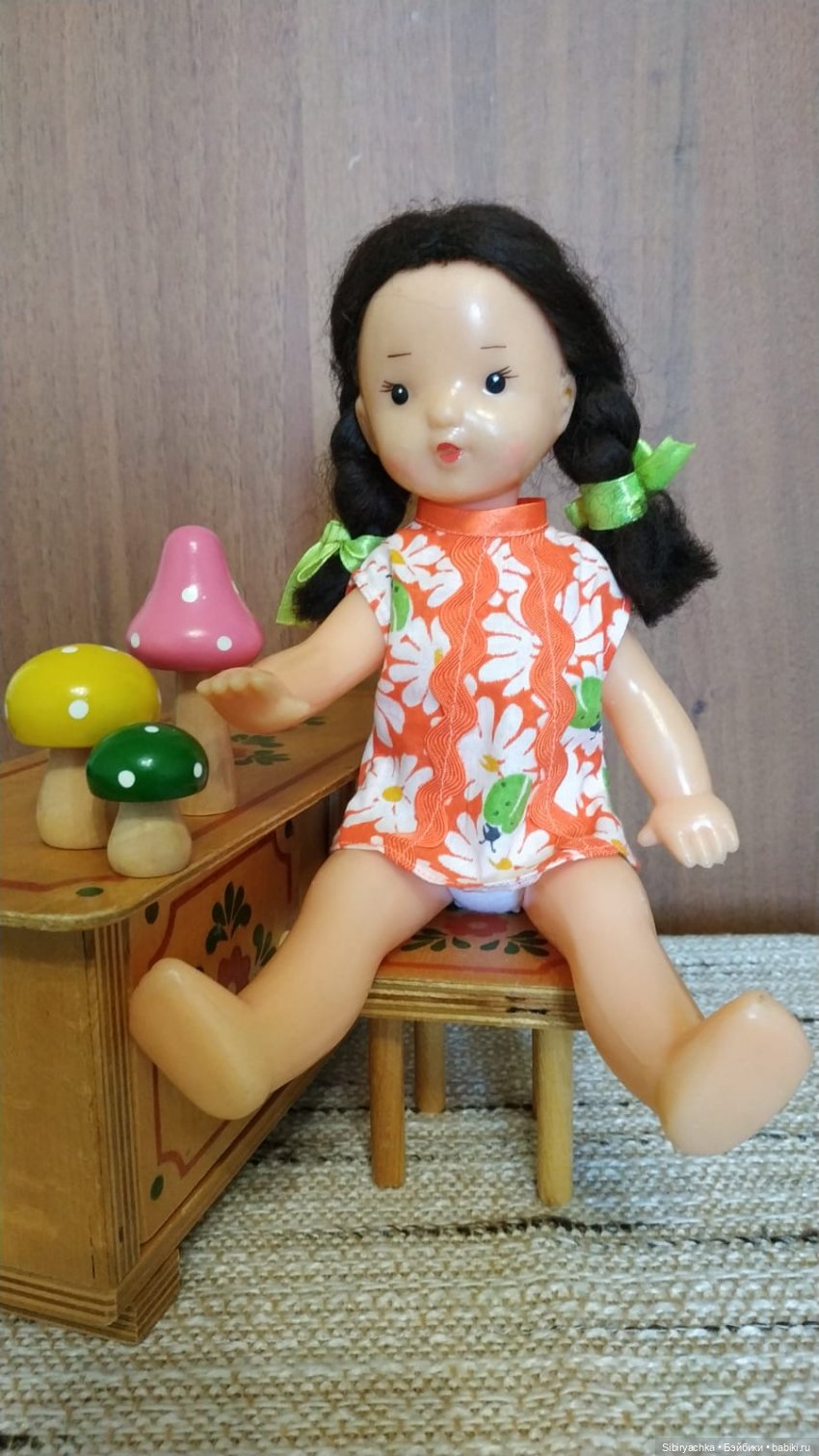 Юля принесла свои любимые деревянные грибочки и расставила на тумбе.