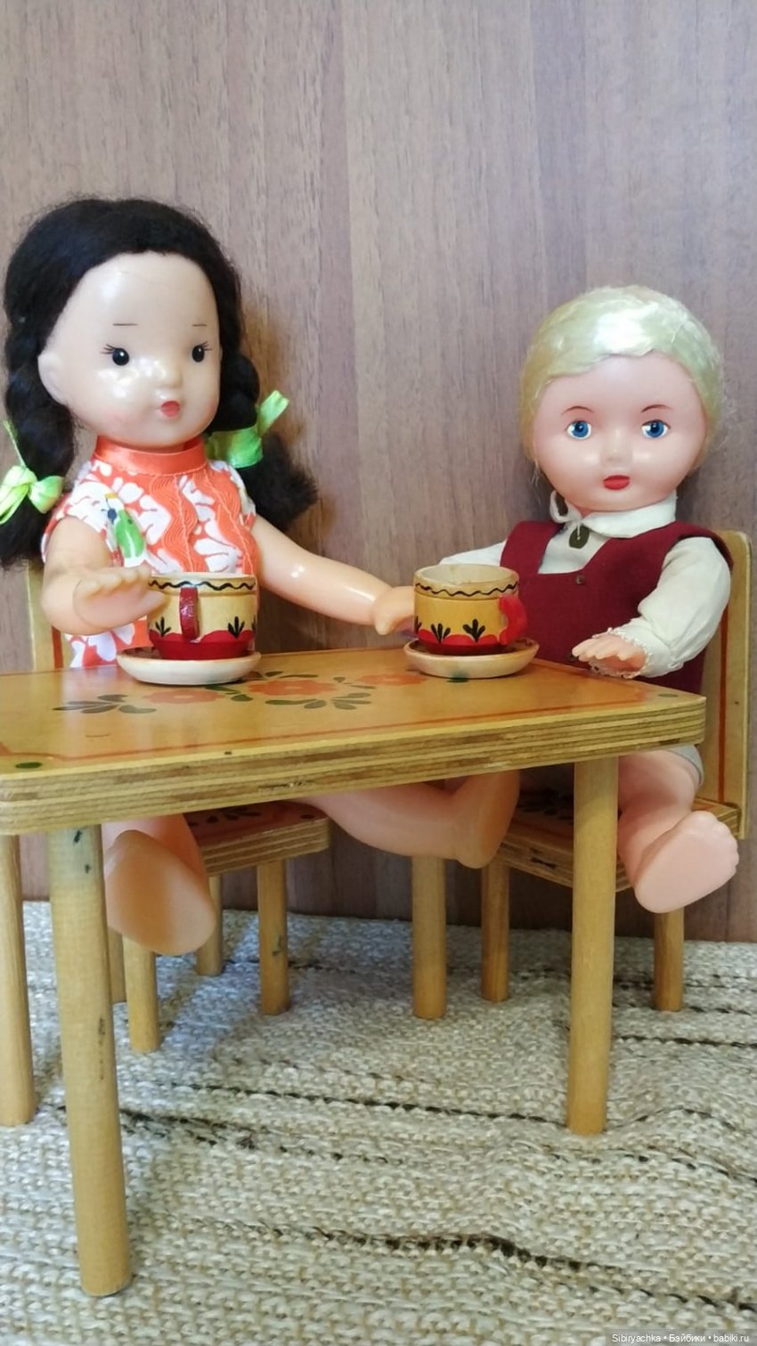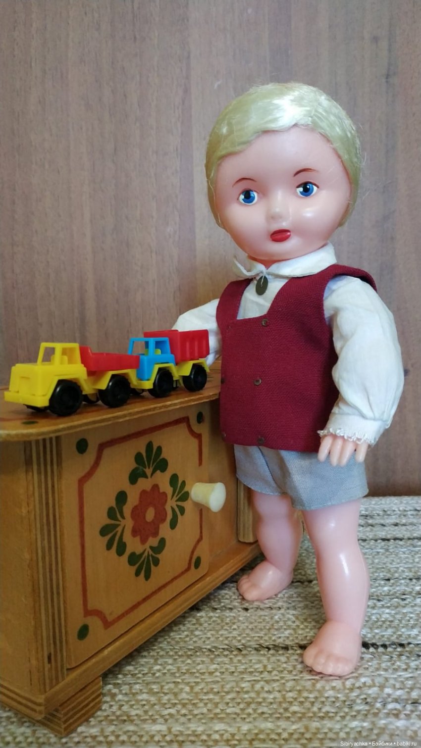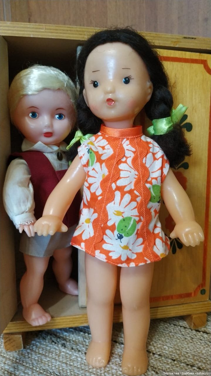 Показывать мебель мне будут помогать очаровательная куколка Юля — малышка, выпущенная фабрикой «Кругозор», Москва, СССР и мальчик, выпущенный фабрикой Salve, Таллин, Эстония, СССР.