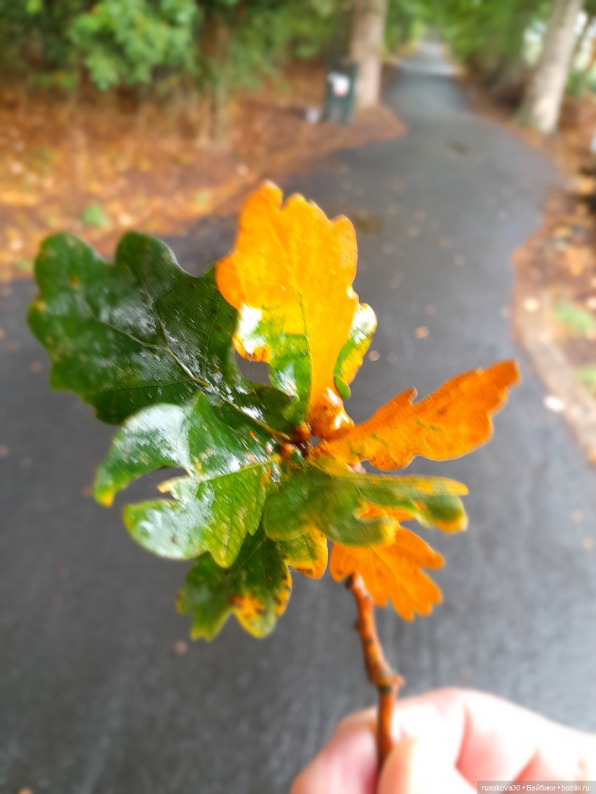 Патрикеевна нашла несколько зелёных листочков и удивилась, как она могла не замечать такую красоту в лесу, который стоит раскрашенный в золотые и пурпурные тона, целиком отдаваясь воспитанию подрастающего поколения.