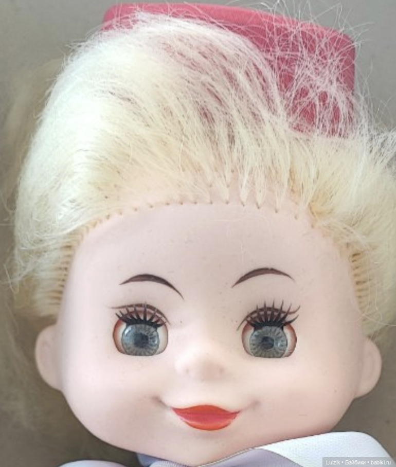 Кукла лежала в коробке в оригинальной одежде около тридцати лет. Механизм глаз рабочий, тело без повреждений и пятен, есть только небольшой дефект отливки на ножке, скрытый обувью, шагрень. Высота куклы 30-33 см, родная прошивка не сказать что густая, в челке редковата, сзади волосы собраны в хвост. Шапочка на волосы приклеена. Одежда снимается, даже есть нижнее белье, на шее бант из ленты — половина голубая, половина красная, с символикой Аэрофлота. Красные туфли из мягкой резины.