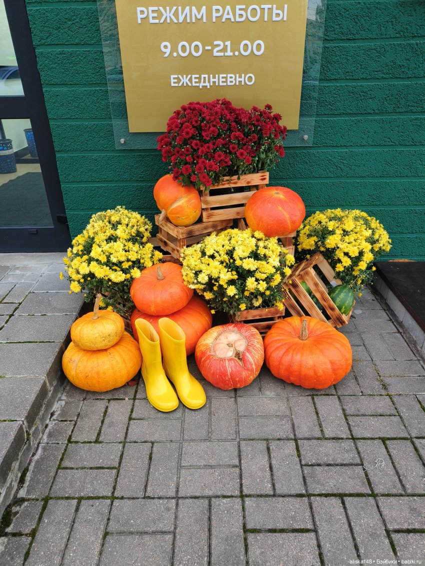 Уже собираясь домой, сделали уличные фото, вход в кафе тоже украшен цветами и тыквами