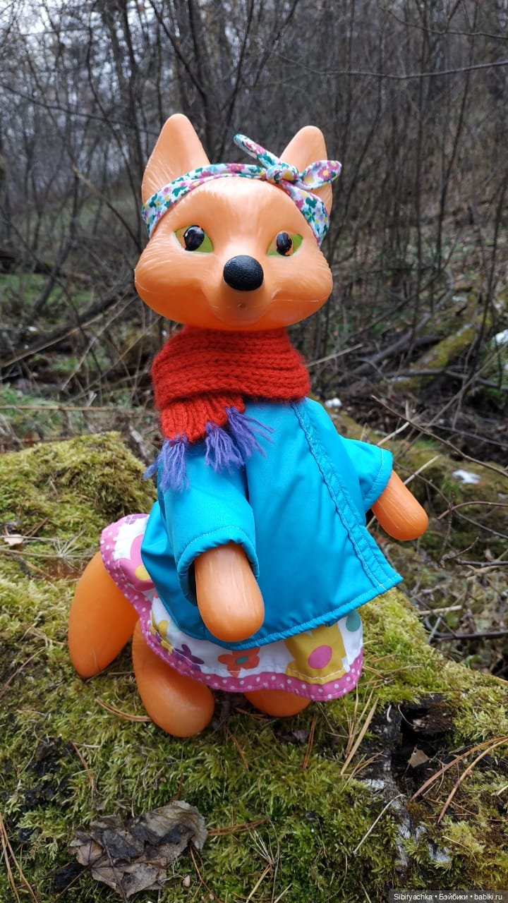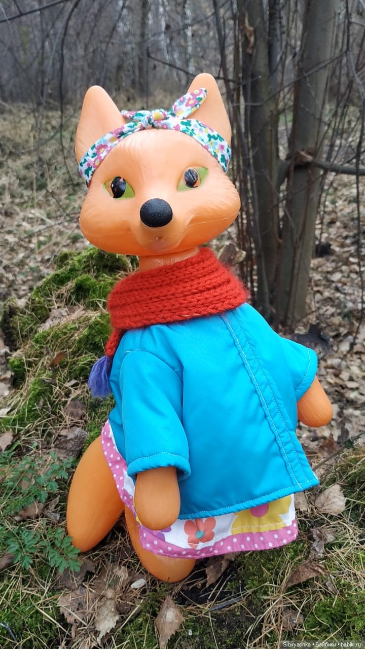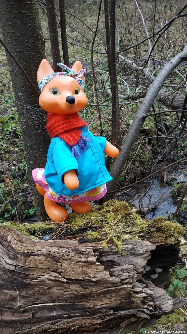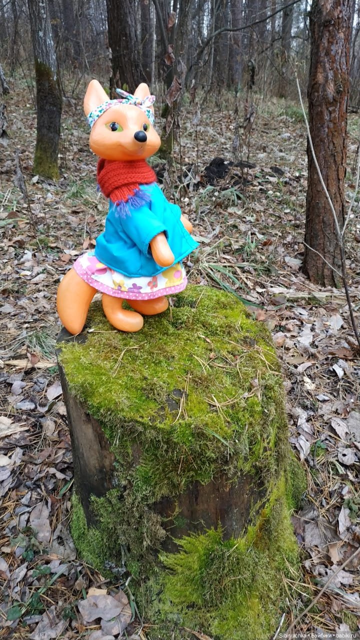 Наша Лиса Патрикеевна сегодня принарядилась. Не годится в одном платье по лесу гулять, ведь не лето красное на дворе, а октябрь-месяц, причём самый его конец. Ещё несколько дней и наступит ноябрь, а это уже зимний месяц в Сибири. Нашлось в гардеробе Лисоньки голубое болоньевое пальто и красный шарф — вполне подходящий наряд для прогулок прохладным октябрьским деньком.