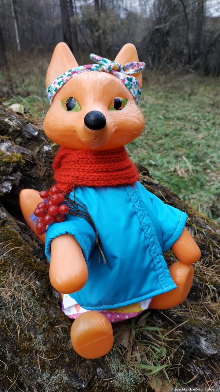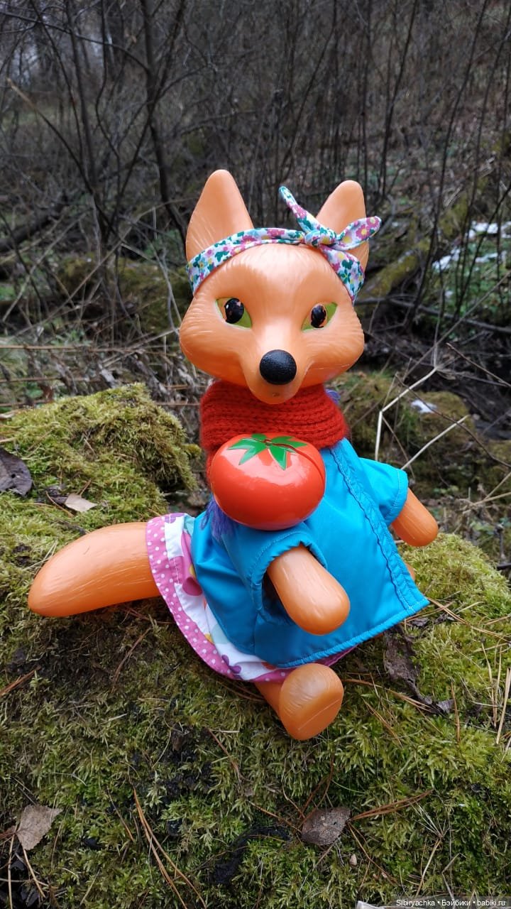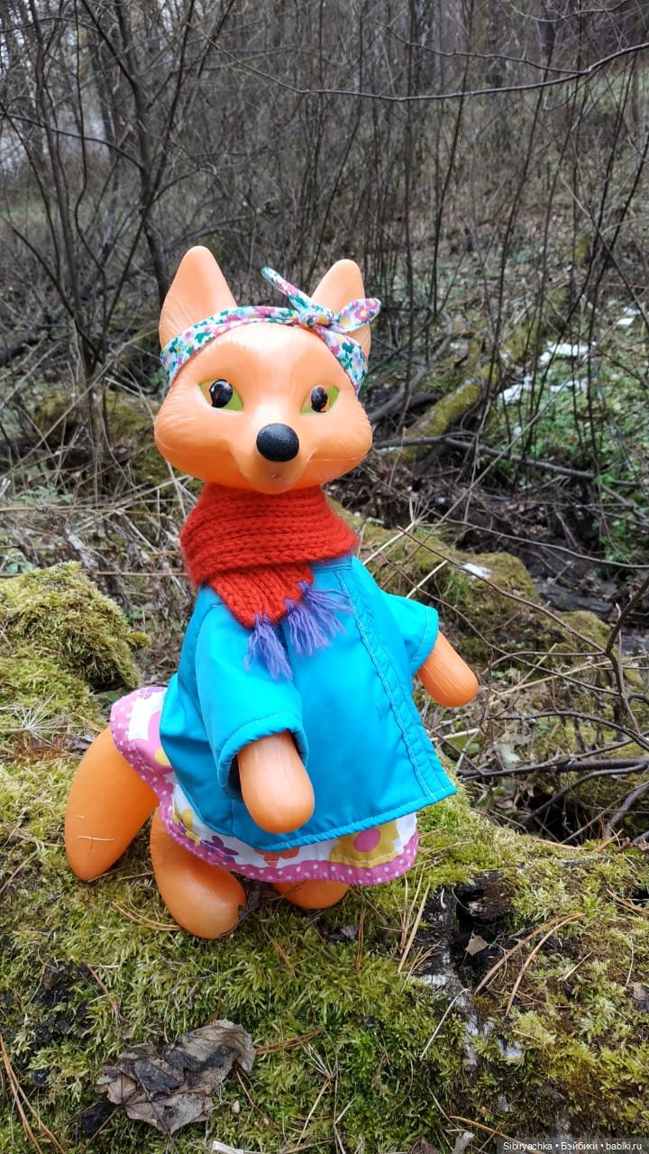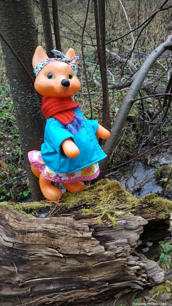 Наша Лиса Патрикеевна сегодня принарядилась. Не годится в одном платье по лесу гулять, ведь не лето красное на дворе, а октябрь-месяц, причём самый его конец. Ещё несколько дней и наступит ноябрь, а это уже зимний месяц в Сибири. Нашлось в гардеробе Лисоньки голубое болоньевое пальто и красный шарф — вполне подходящий наряд для прогулок прохладным октябрьским деньком.