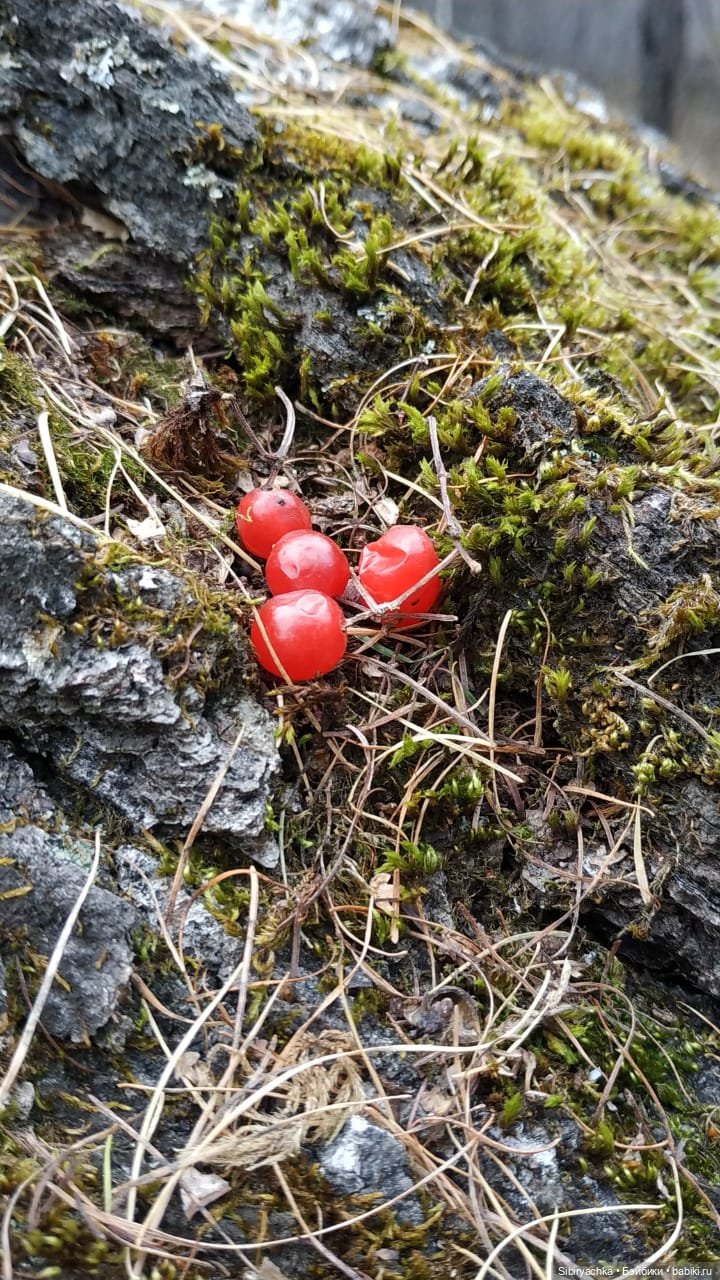 В углублении берёзы на сухих листьях лежат несколько ягод калины.