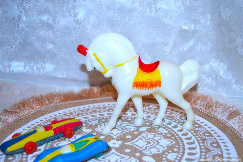 Будучи маленькой девочкой, я всегда мечтала об игрушечной лошади белого цвета, так у меня поселилась эта цирковая лошадка нашего завода и радует по сей день. Правда попону я подрисовывала уже спустя много лет.