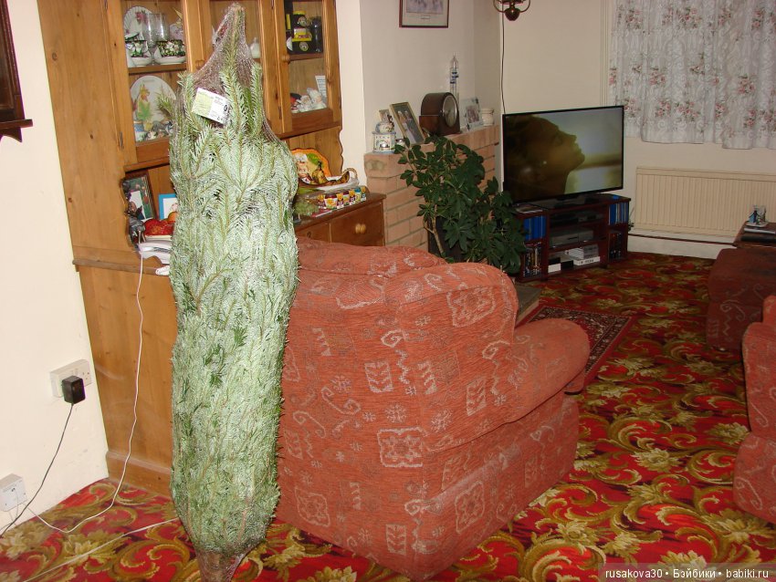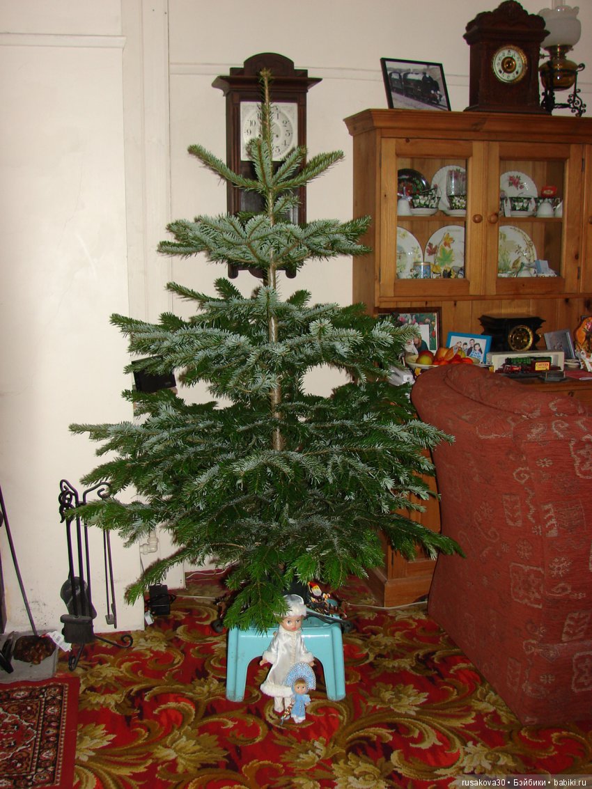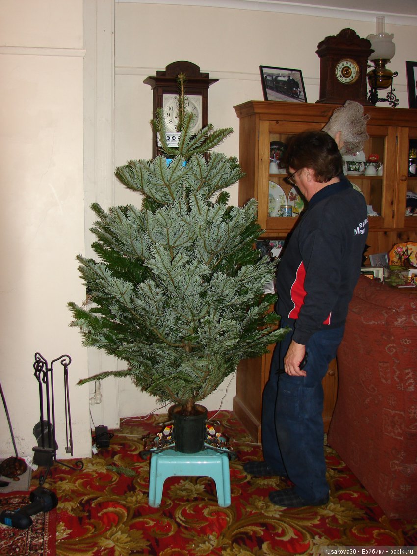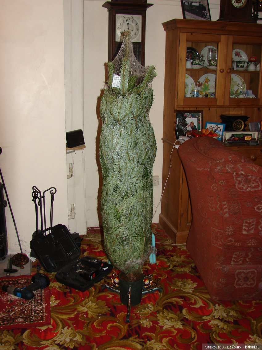 Это он елочку в специальную крестовину устанавливает. Она в виде ведерка, мы туда воду постоянно подливаем, чтобы елочка как можно дольше стояла.