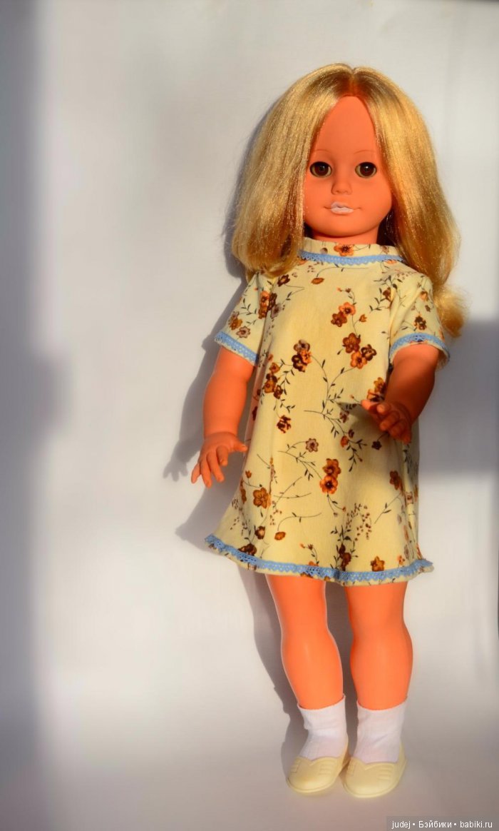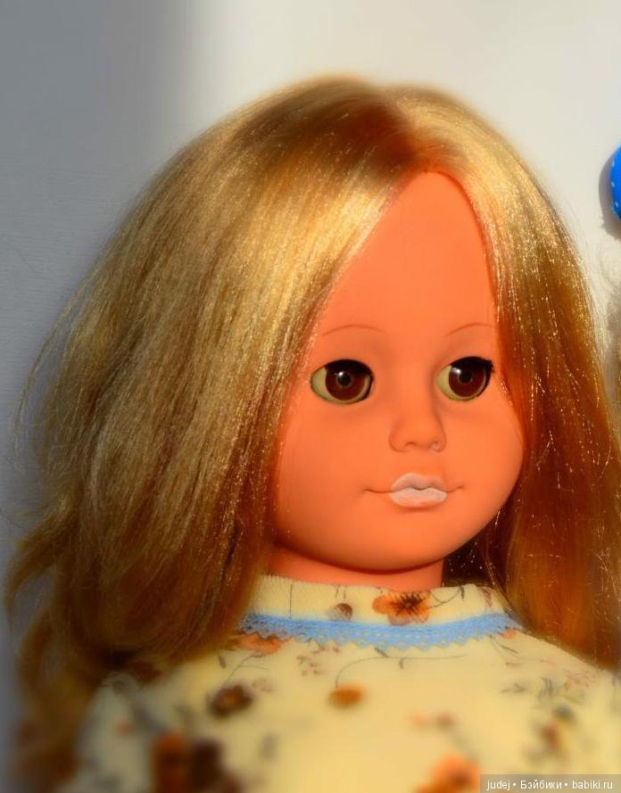 Еще одна днепрянка. Более ранняя модель этой куклы выпускалась с клееным паричком и имела раннее клеймо. Но эта кукла уже с прошитыми волосами и со средним клеймом. Видимо ее можно отнести к переходному периоду, началу 70-х годов. По словам продавца: «в 1971-м уже было так называемое «среднее» клеймо. Ее башмачки с двумя отверстиями, что практиковалось в давности».