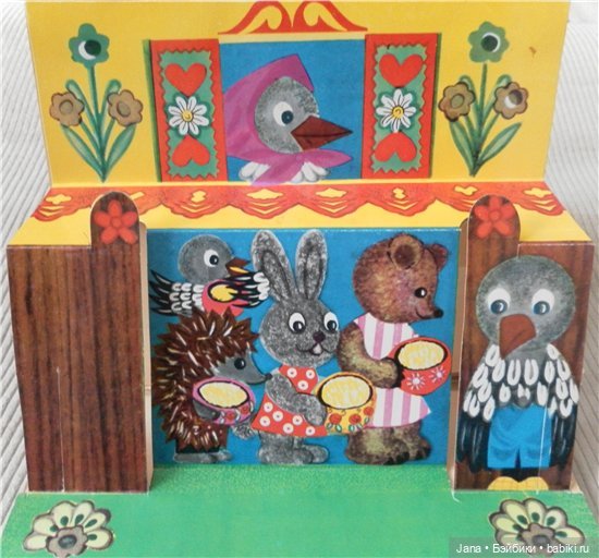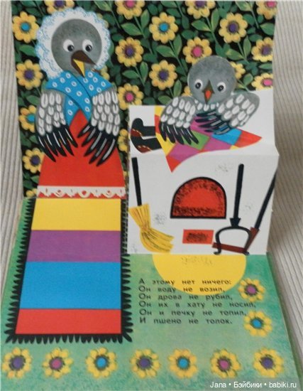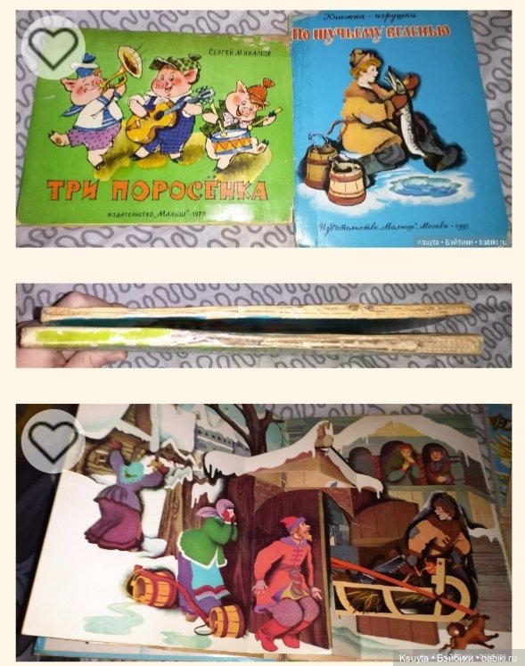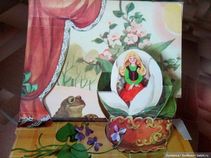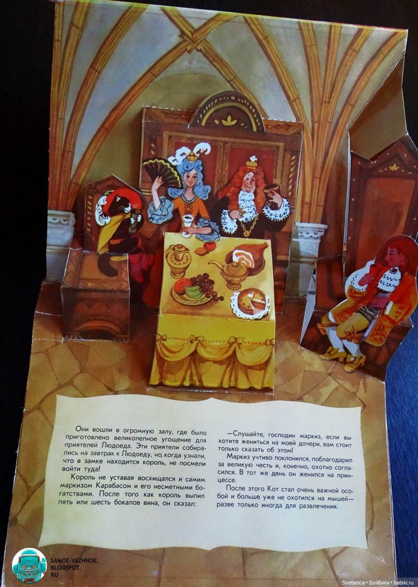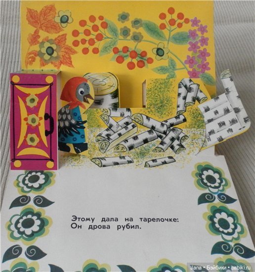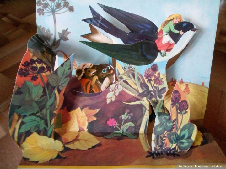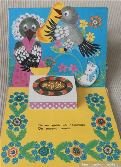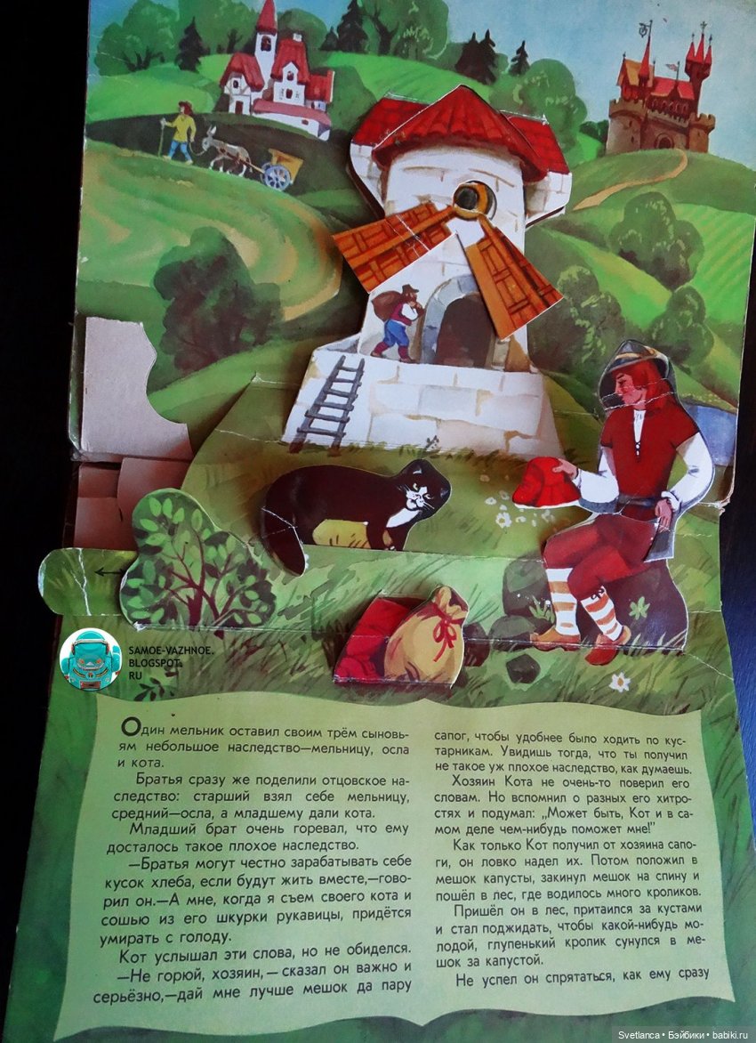 В книгах 50-60-х очень много именно подвижных картинок, а не просто объемных. В книгах 70-х годов сохраняются подвижные картинки, но их уже меньше и они сделаны проще. А уже более поздние, особенно 90-е годы совсем уступают в качестве печати и картинок подвижных очень мало. Хотя, может быть разные издательства выпускали книги разного качества. Вот смотрю сейчас Кот в сапогах издательства «Малыш» 1982 год и туже книгу «Велелка» 1986 год. Первая ярче, бумага глянцевая. Но, все-же качество уступает книге 60-х годов.