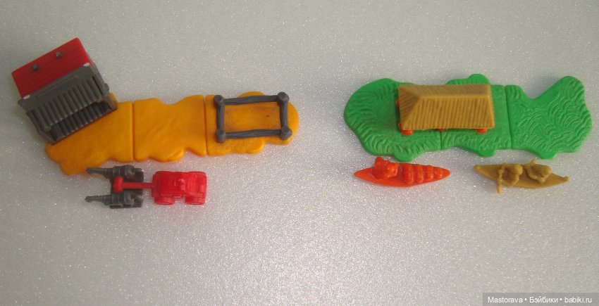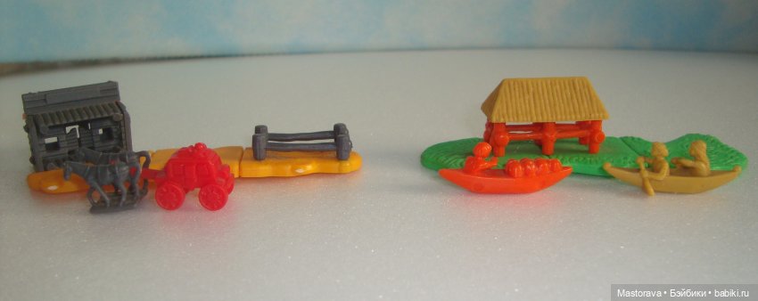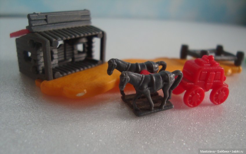 Первой моей игрушкой с шоколадного яйца была карета с лошадями, желтая пластина имитирующая дорогу на одном краю которой располагалась таверна дикого запада и загон для лошадей. К сожалению, после игр моего старшего сына с этими игрушками остался только экипаж