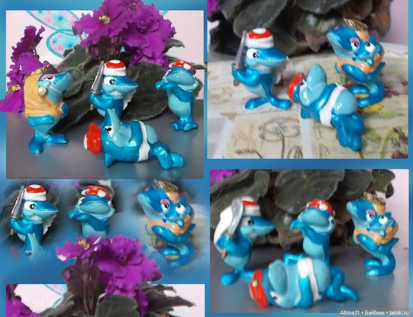 Сиреневая собачка была в плетенном сундучке, который не дожил до наших дней, этот щеночек был первый питомец для моих кукол. А потом начали попадаться статуэтки бегемотиков, пингвинчиков, динозавриков и прочих. Понятное дело что собрать всю коллекцию не представлялось возможным. А помните как говорилось в рекламе, что каждая игрушка раскрашивается вручную?)