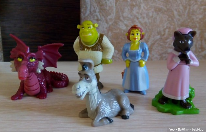 Фигурка Шрека (2006г)подвижная: поворачивается голова, руки и ноги сгибаются. У осла (2007г) крутится голова и он со звуком.