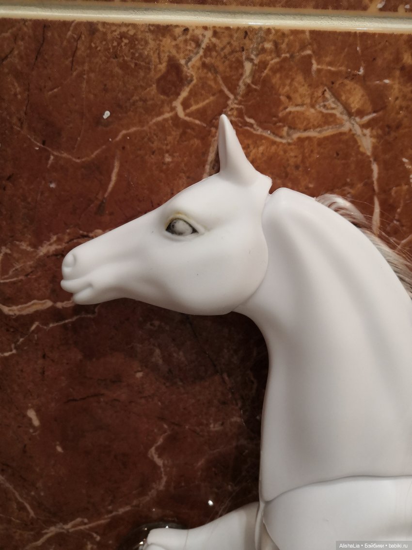 Уздечка оказалась продета под приклеенной гривой. Печалька. Из недостатков нашлись проступающий прутик на крупе и 2 дырочки под седлом. О них уже писали в отзывах, видимо они технологического характера.