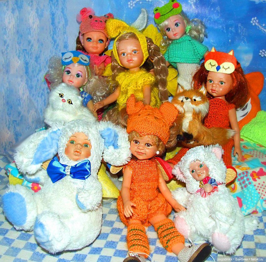 А пушистые тела никуда не подевались. На мой взгляд — новые головушки очень интересно «вписались» в образы Зайчонка и Котенка. Вот они в компании моих куклёшек на «Звериной пижамной вечеринке))).