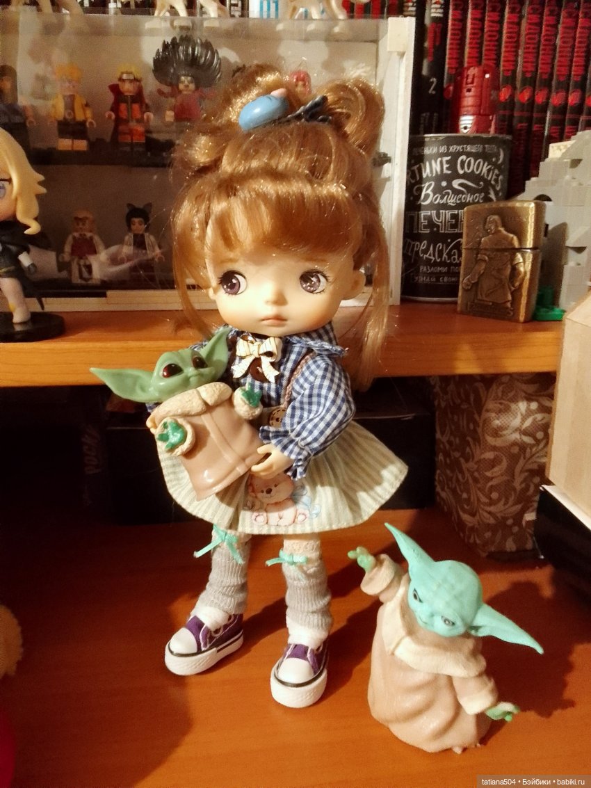 Он у меня парень взрослый и к коллекции кукол не однозначно относится, при этом мал помалу создал свою. Грогу пока в планах, перебили мои кукольные темы, но вот малышей бюджетных, так для интереса, приобрела. Для фото с куклами смотрятся прикольно, но вот вонь от резин — жуткая! Поэтому достаю только для фоток. Хотя по началу сын их поставил на свои полочки. У нас такие пока:
