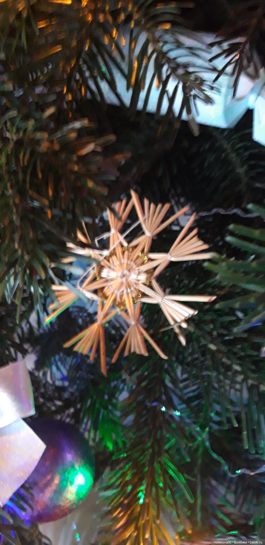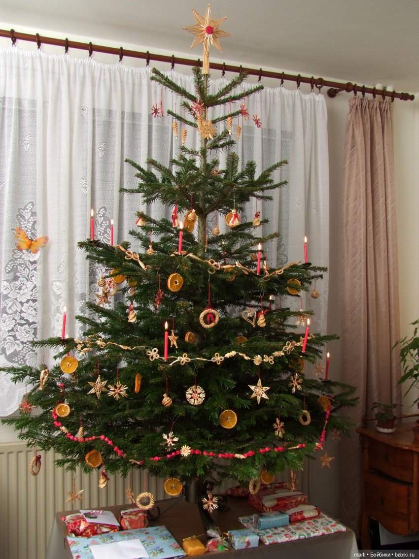 Мы с рождением детей завели традицию украшать елочку нарезаными сушëными апельсинами и елочными игрушками из соломы — мне всегда такие нравились и к тому безопасные, можно уронить :) Свечки у нас на елочке всегда настоящие.