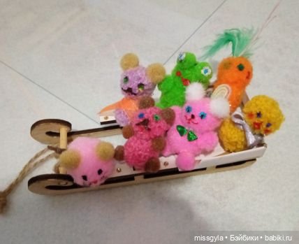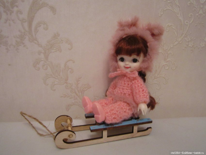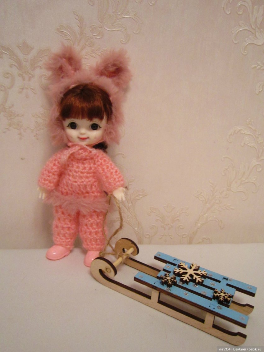 Я купила в фикспрайсе саночки (для фото с куколками — самое оно) и еще фигурку зайки в пакете.