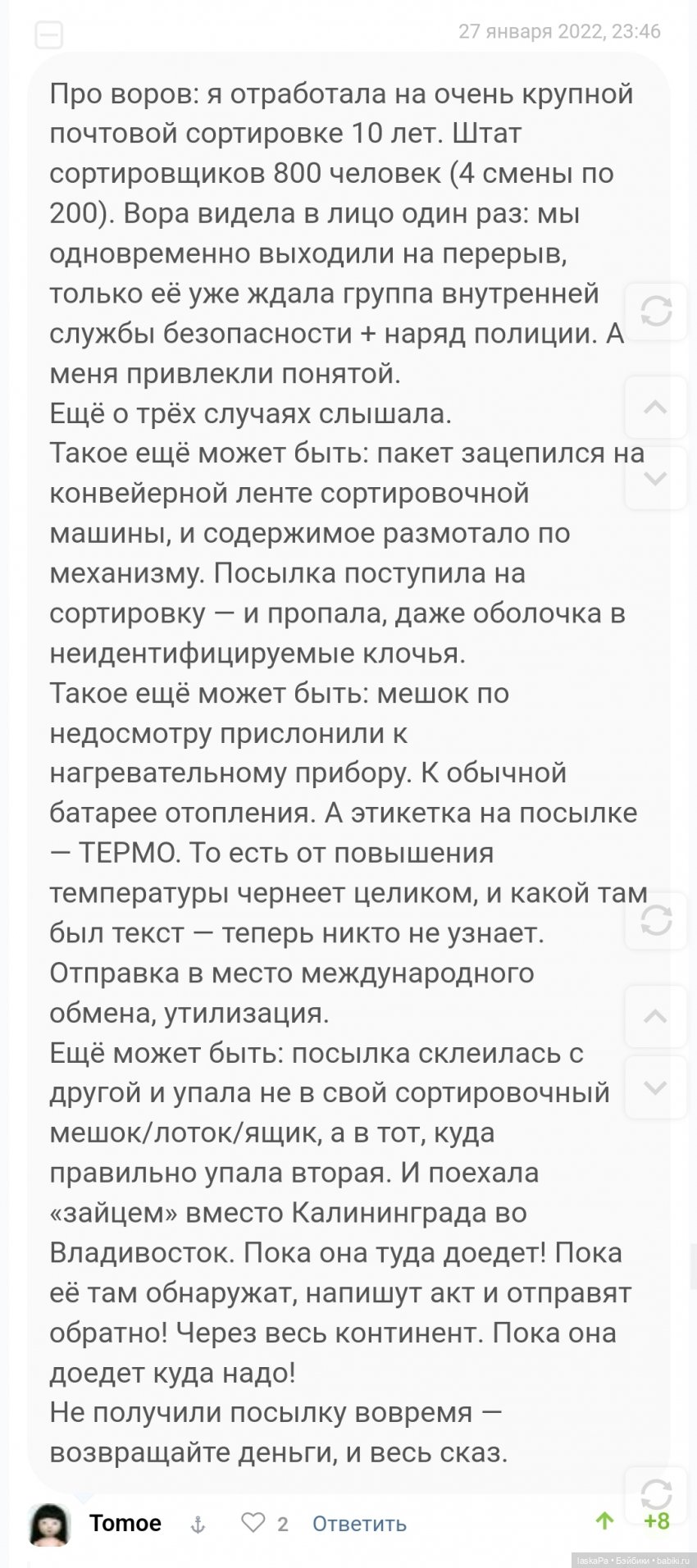 Кстати, в моем случае я высказывала операторам, что посылка выглядит вскрытой. И, видимо, не я одна, через пару месяцев эти вещи прекратились.