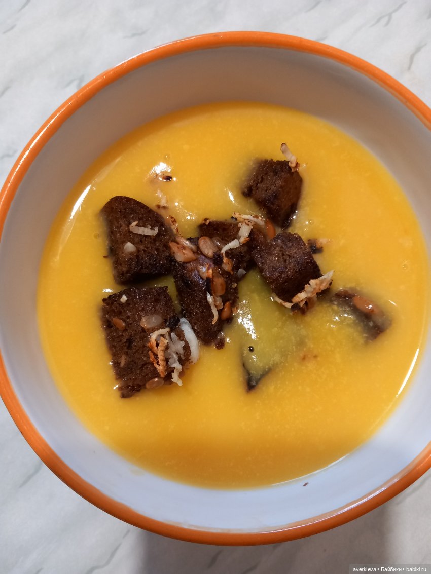 Когда тыква стала мягкой, мы достали блендер и проблендерили мякоть. Долили сливки и снова поставили на огонь. Немного подарили, и вуаля! Вкусный, полезный и яркий суп готов.