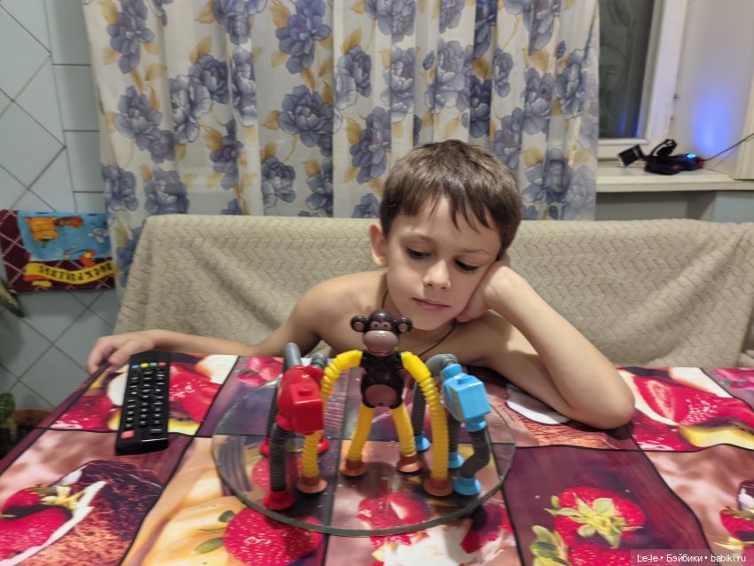 Особенно ему синий понравился, он с ним долго играл, а потом как-то прицепил на холодильник в такой замысловатой позе: