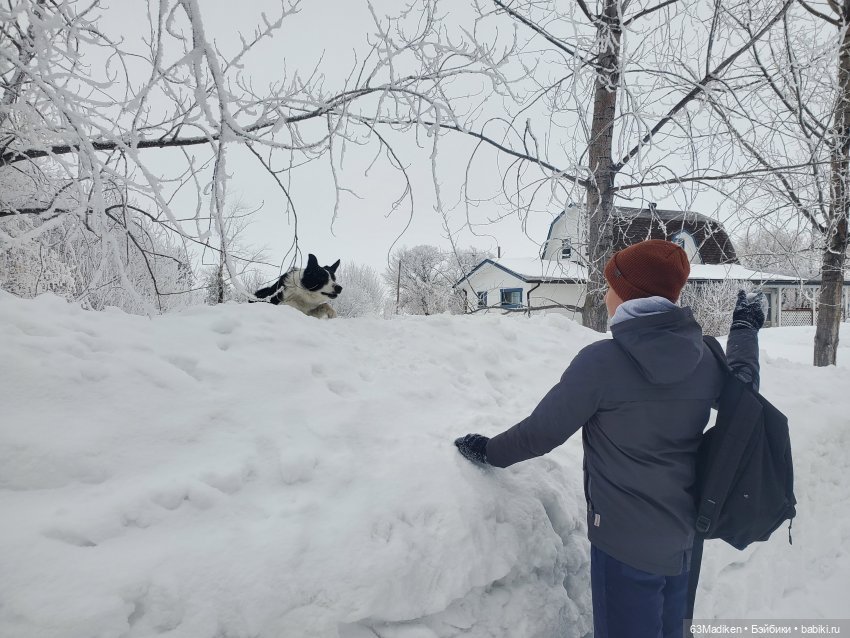 Сын, в ожидании школьного автобуса, играет в снежки с собакой😉