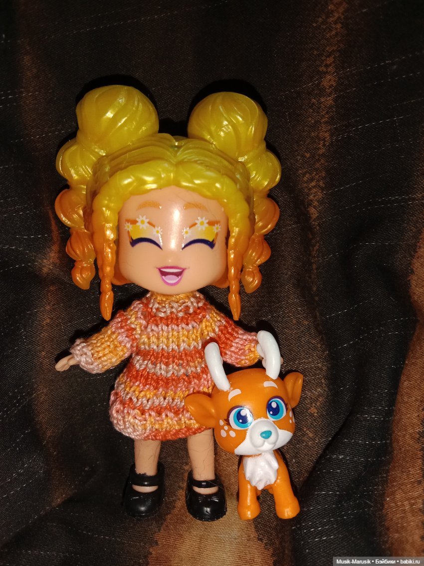 Качественный пластик, мягкая резиновая одежда и волосики. Голова пластик; тело и руки, ноги — плотная резина или ПВХ. Лицо меняется легко — поворачивается движением пальца. Три вида выражения. Может не совпасть с картинкой на коробке. Рост куклы около 10,5 см; рост питомца (поворачивается голова) — 3,5 см.