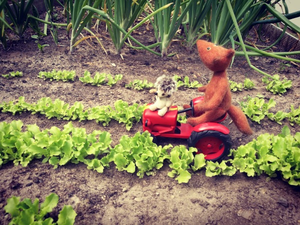 Теодор тоже заядлый гонщик… и тракторист. Рассекает с другом по грядкам. :-)