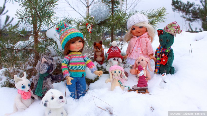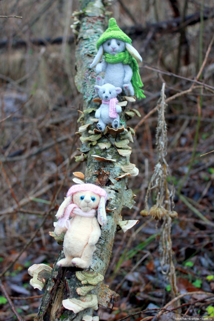 Здесь можно увидеть кошечку Луизу (белая с розовым шарфиком) и зайку Аркадия. Это Рождество 2020 г. на Волге.