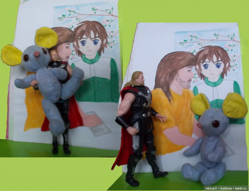 А это старое фото, новые кадры с ними чего то не получились, лениво всё заново расставлять :) Сразу не проверила, а сегодня вот желание нет переснимать, хотела новые фигурки пощёлкать, да что-то темновато. Оказывается у меня мягких хватает :))) Сейчас флешку поменяю, если кадры получились затисканного медвежонка покажу :)))