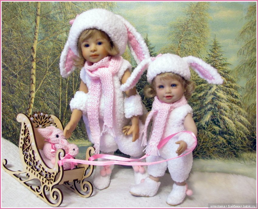 Какие милые девочки в красивых костюмчиках к нам пожаловали, да не одни а с зайками на саночках!!!