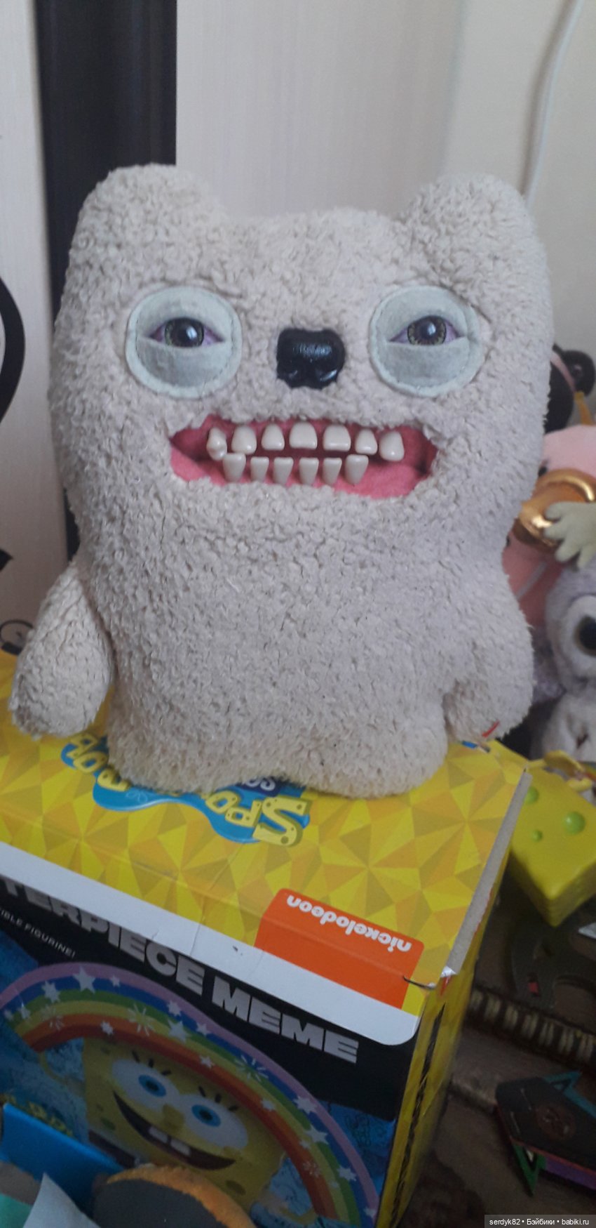 Сшит из плотного фетра ( дубового прям). Ярлычок как настоящий. Глаза и зубы не вклеены, а вставлены внутрь головы на увесистом основании!!! Пуговка на попе тоже имеется, тоже вставлена в тело. Но глаза и зубы в темноте не светятся… Не знаю это фирменный знак всех фаглеров или оно не обязательно.