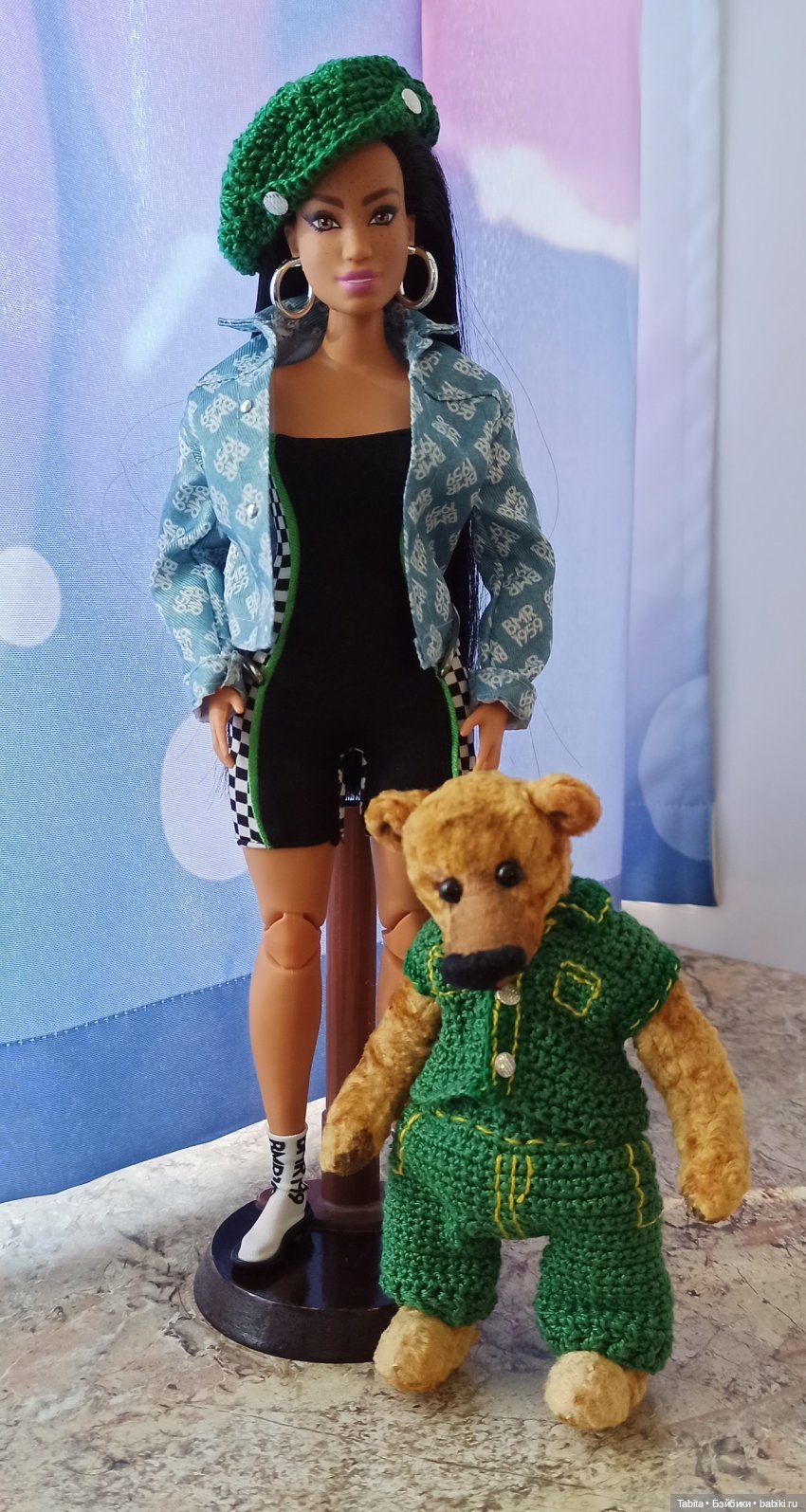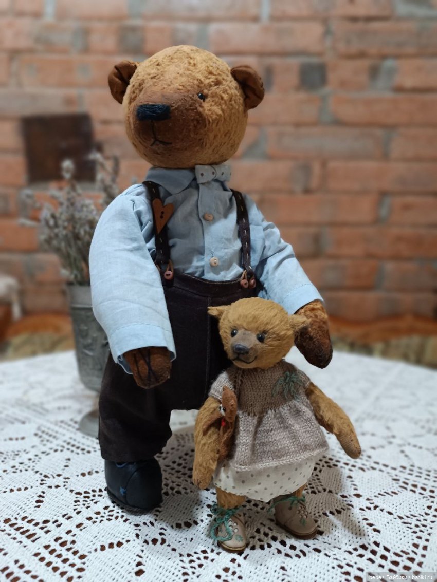 «Мишка сшит полностью вручную из винтажного плюша ручного окрашивания. Голова и лапы поворотные, голова качающаяся, соединение пуговично-нитяное. Глазки пластмасса, нос вышит, немного тонирован акриловыми красками. Может сидеть, стоит с опорой». Подумала, ну, что же, не может стоять без опоры, будет сидеть с моими игрушками, меня радовать. Приехал, сказал, что называть его можно просто Федя. Медвежонок очень классный, сидит часто рядом. Любит общение. Он участвовал с барбейками в домашних съёмках, ему приятно внимание, но вот хотелось ему на улицу. Все гуляют, он же не хуже. Он классный парень! Укрепила я ему шею, чтобы качающаяся голова ходить не мешала.