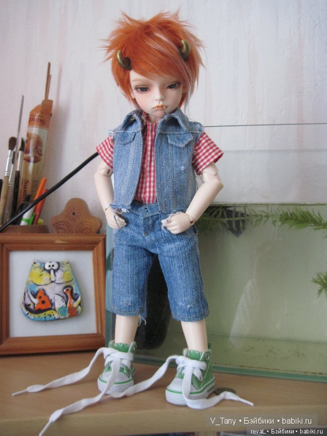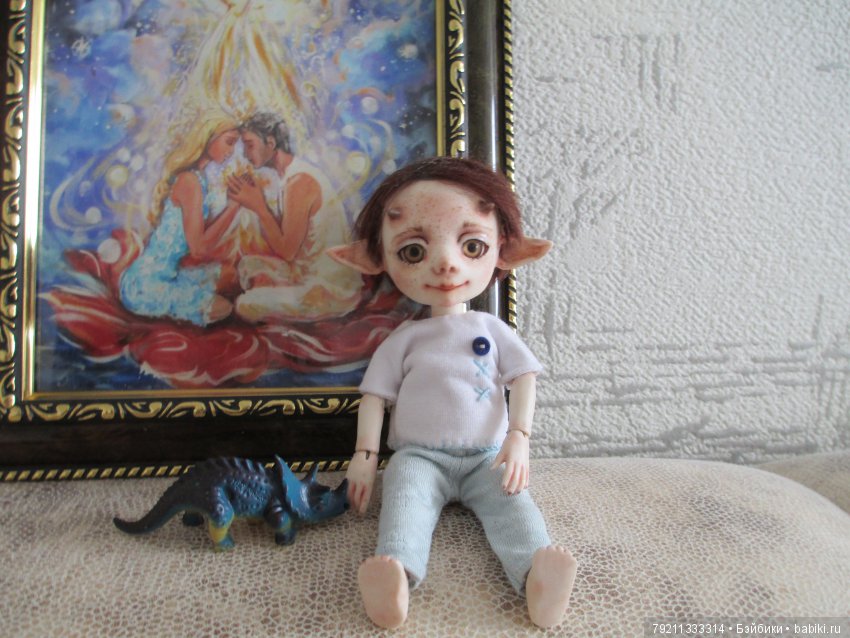 И вот, маленький печальный барашек, уже несколько месяцев живет у меня дома. Имя родилось уже в момент стремительного броска руки к заветной кнопке, образ завершился за пару дней. Мои кукложители приняли малыша «утю-тю-шами», младшие ребята завалили подарками и дали ему местечко в своей комнатке.
