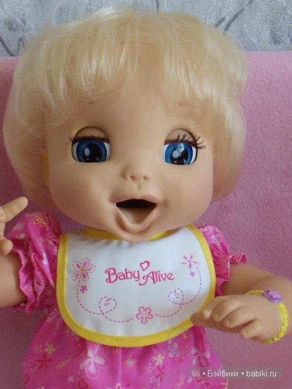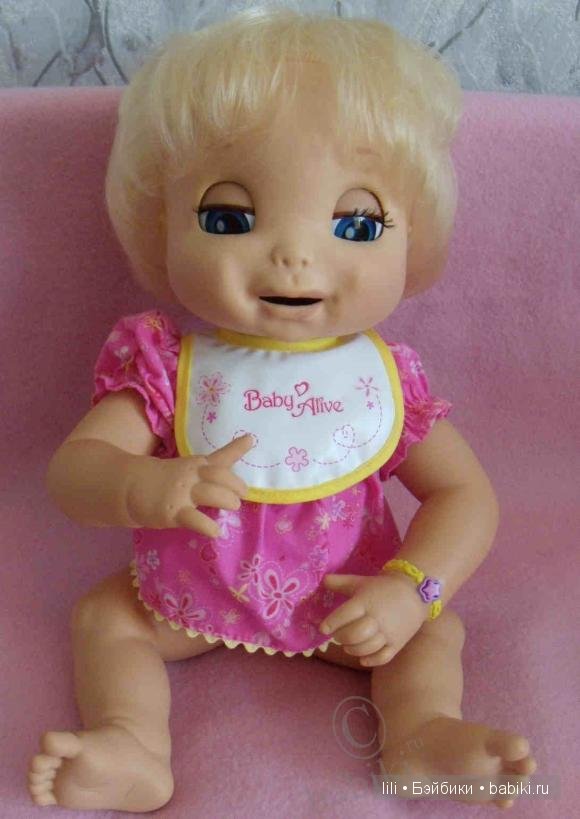 Аливка — Baby Alive Learns to Potty — ее полное название. Кукла как маленький ребенок ходит на горшок кукла от Hasbro ест, пьет, она смешно хлопает глазками, разговаривает с мимикой, тоже прикольно выглядит, кукла интерактивна, у нее мультяшные, огромные глаза, и копна вьющихся волос. Нажав кнопку браслета, кукла проснется и будет говорить «я Люблю Тебя, Мамочка». Когда она говорит, ее глаза мигают, и ее рот движется в такт с ее слов. Когда она говорит: «я голодая», — это намек, чтобы прокормить ее. Да… куколка англоязычная…