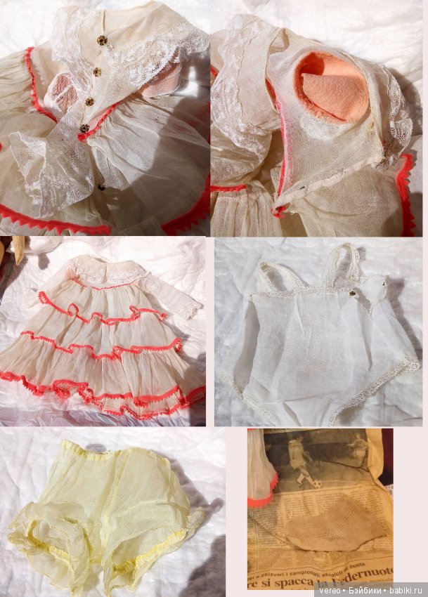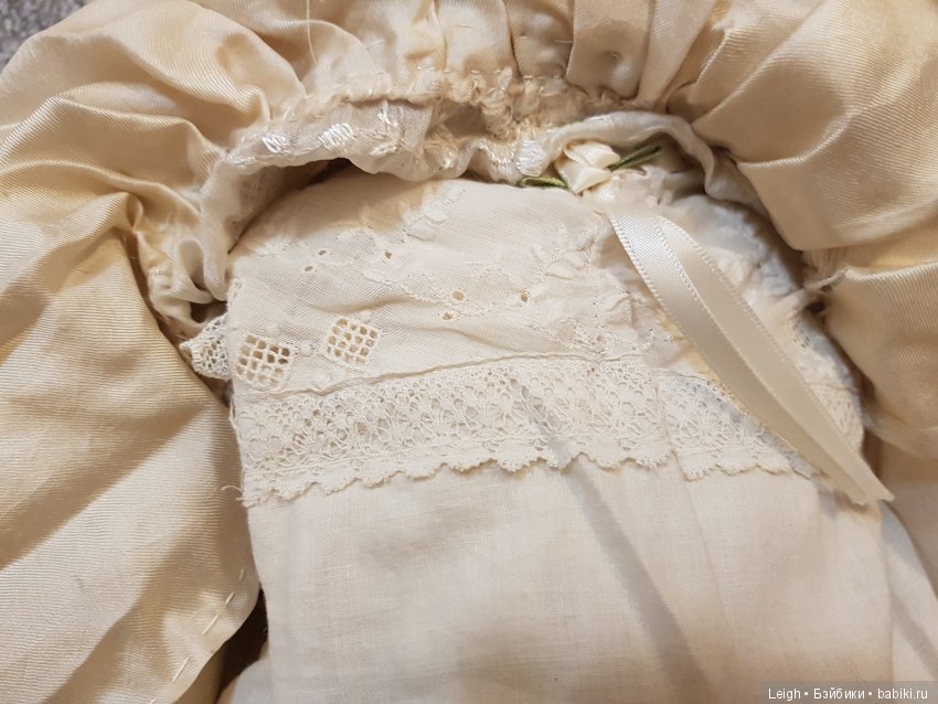 Платье, скорее всего, шилось уже дома, В попытке придать подобающий вид куколке.Фабричные антикварные поатья не были такими «тяжелыми» в плане выбора ткани… нижнее белье разноплановое… пуговки пластиковые.
