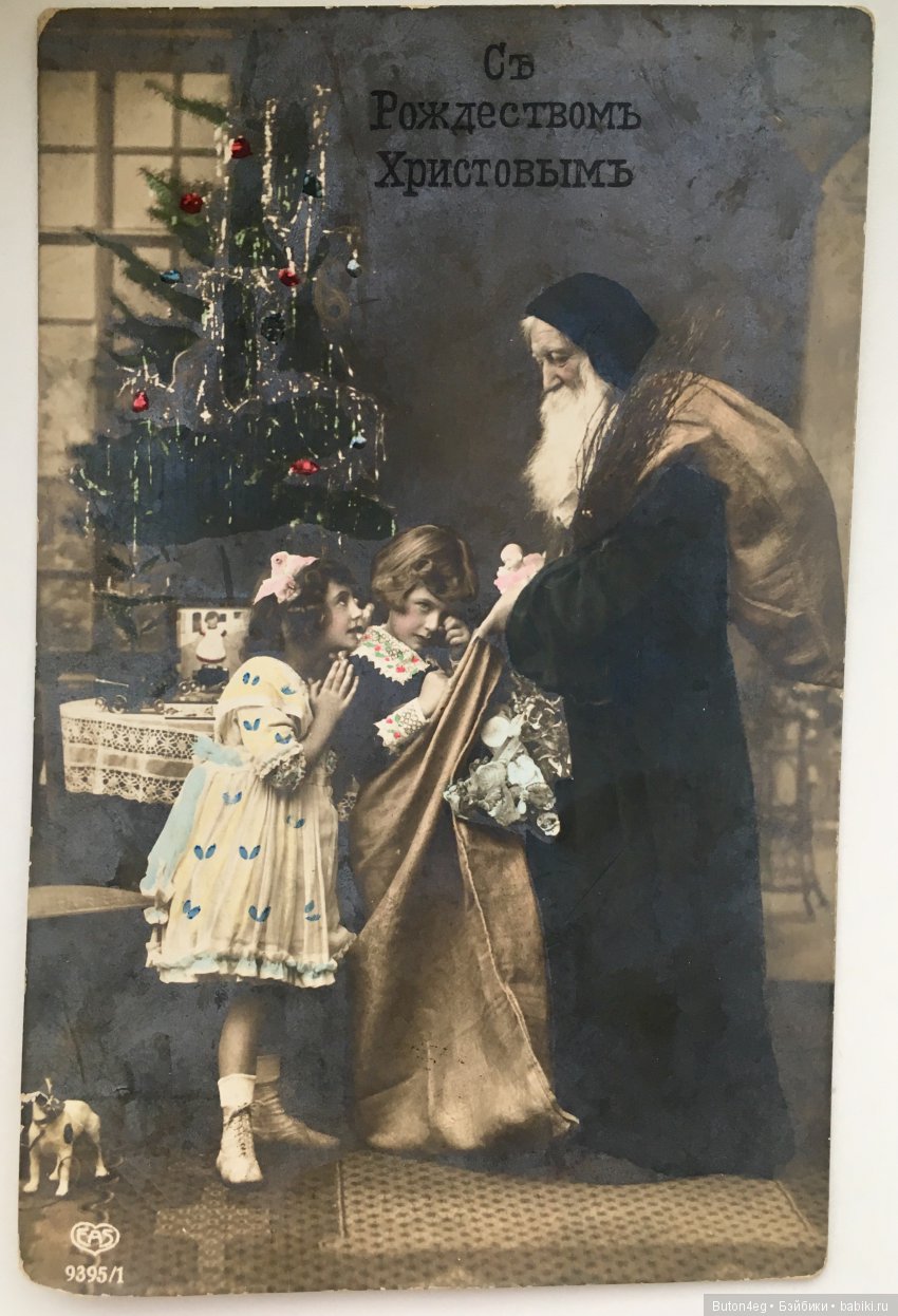 Да, вторая открытка — не характерная. Думаю, дореволюционный «фотошоп») Сказка, чудо. Санта, типа джина — материализуется из ничего. Видите, и куклы тоже чем ниже — тем прозрачнее)