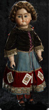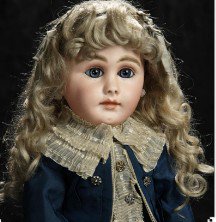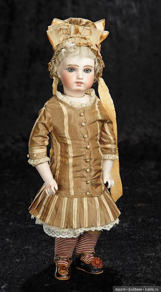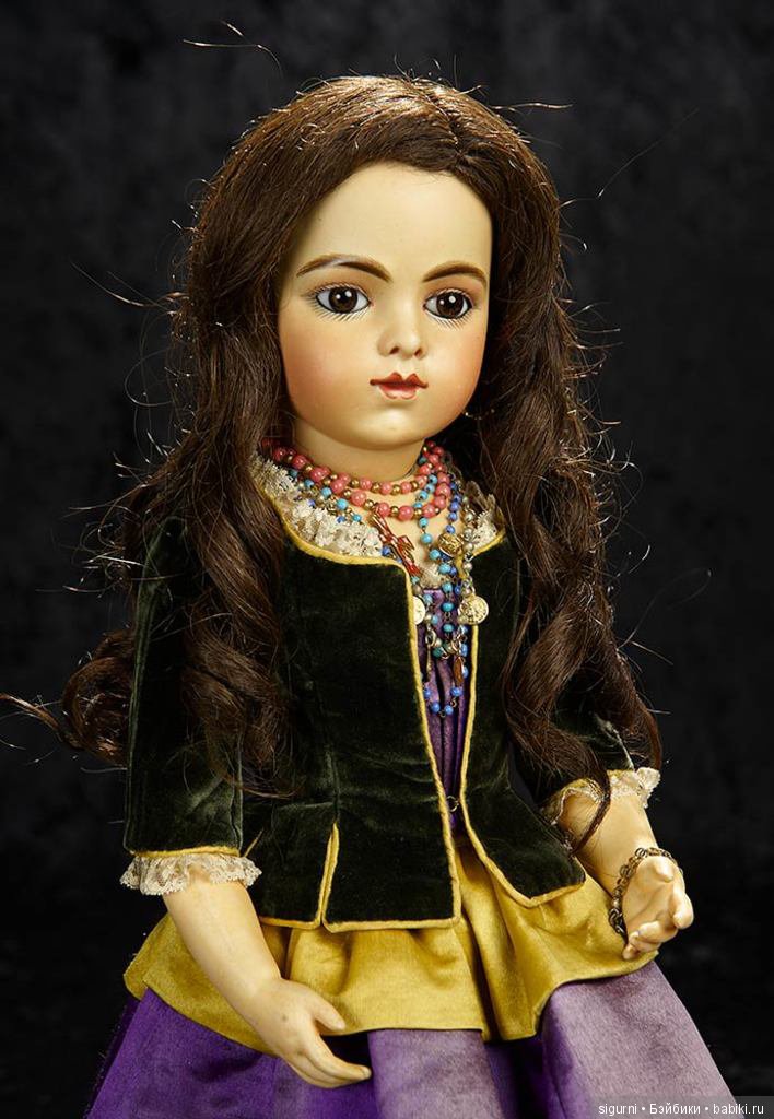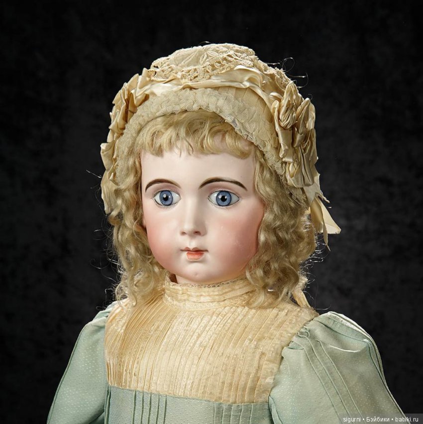 «Pierre-François Jumeau, около 1870 года, грандиозный размер и роскошное качество бисквита и живописи предполагают, что кукла была первоначально создана как выставочная модель. Оценочные баллы: тонкая скульптура портрета, как особенности, дополнительно усиливаются тончайшим качеством бисквита, нежным цветом лица и превосходной живописью особенностей.» 29 дюймов (74 см), продана за 10 тыс. долларов.