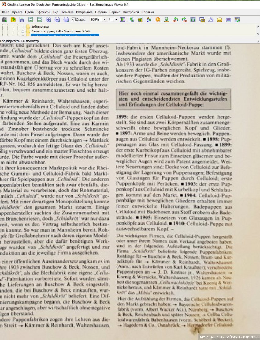 Здравствуйте, уважаемые жители Бебиков. Много говорят про Цизликов, все слышали про Цизликов, и многие хотели бы посмотреть их, ознакомится с бесценной информацией, изложенной на страницах этого многоуважаемого издания. Но к сожалению немногие в нашей стране имеют такую возможность. Именно поэтому родилась идея — отфотографировать страницы Сieslik's Lexikon Der Deutschen Puppenindustrie и выложить из в виде Топиков на страницах нашего многоценного ресурса под названием — Бебики. Всего Топиков будет семь или даже восемь, потому что в книге 365 страниц, а в каждый топик можно выложить 50. Можно было бы выкладывать частично, только самые значимые страницы, но я хочу избежать дополнительных вопросов — «А вот там есть еще страницы между двадцатой и двадцать третьей, а что на них?...», к примеру. Поэтому выкладываю планомерно все, без исключения страницы. Читайте, рассматривайте иллюстрации, переводите с немецкого, по возможности переведенное выкладывайте в комментариях к Топику, что бы пользователи, не владеющие немецким языком, могли знакомиться с переводом и извлекать полезную информацию из энциклопедии.